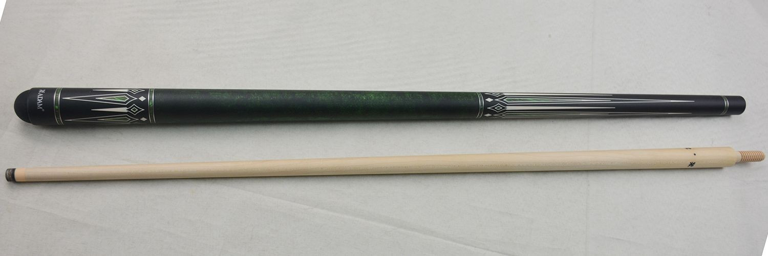 Los tacos Adam Professional Zonin tiene una junta atornillada de madera y una flecha de madera de arce sólido. El taco de billar Adam Zonin tiene una virola Cerocite de 8,2 mm con placa Gamma, y un suela Everest. La empuñadura de este llamativo taco de billar Adam Zonin es verde con una calcomanía de birdseye verde. Por encima y por debajo de la empuñadura, la culata tiene una calcomanía en negro, blanco hueso, malaquita y plata. El taco tiene un acabado mate, y una longitud de 141cm.